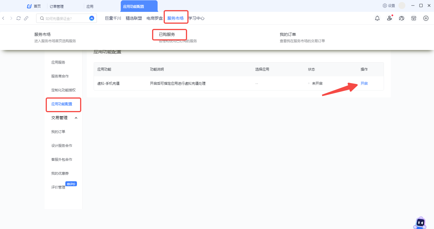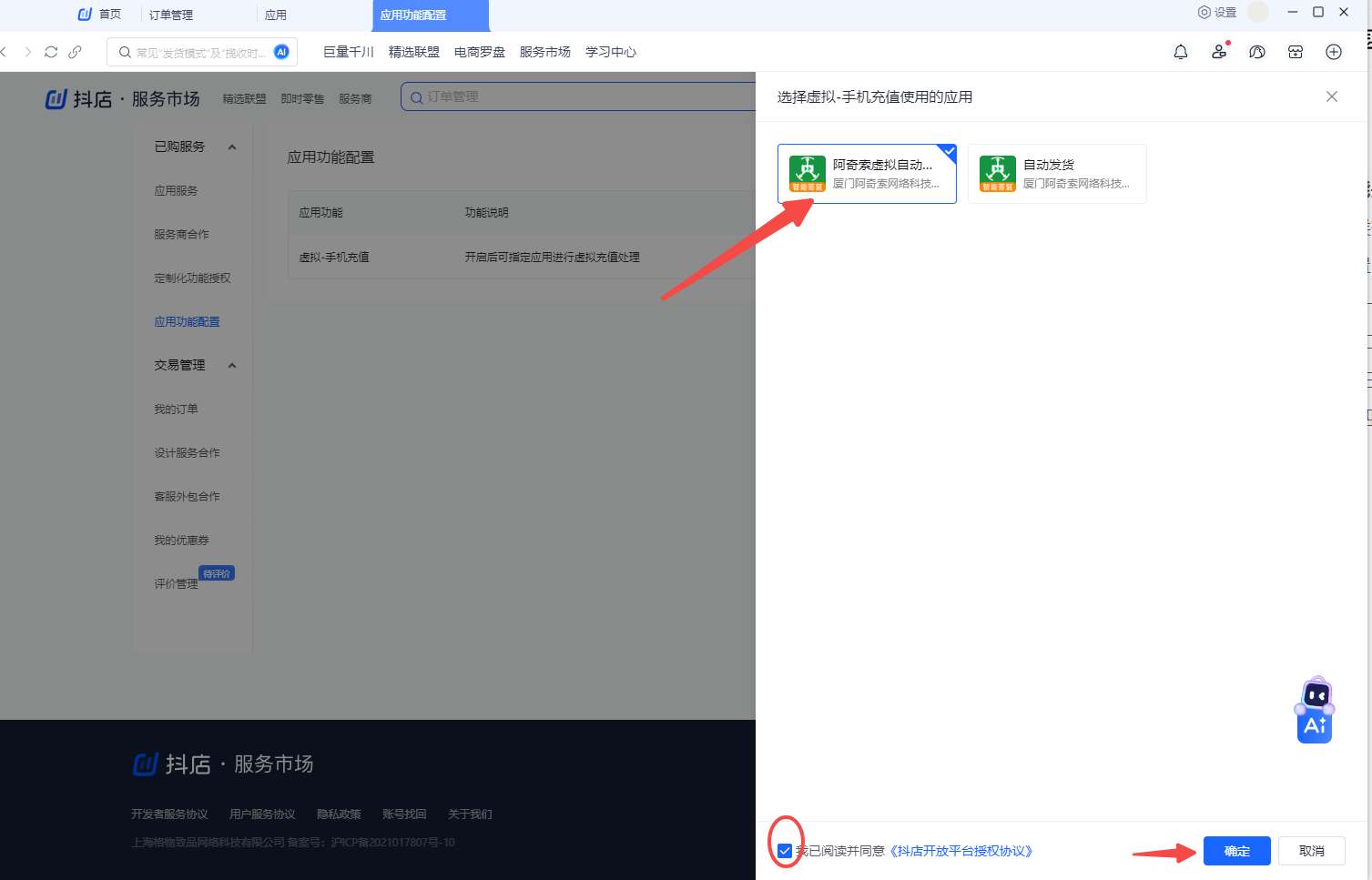 订购后,在抖店商家后台--服务市场--已购服务--应用功能配置--找到【虚拟-手机充值】点击“开启”---选择【阿奇索虚拟自动发货】--勾选协议--确定