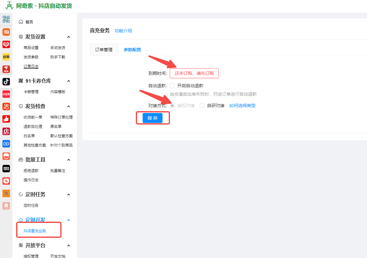 定制开发--抖店直充业务--参数配置--订购应用--订购后,对接方式按默认的"授权对接"--保存