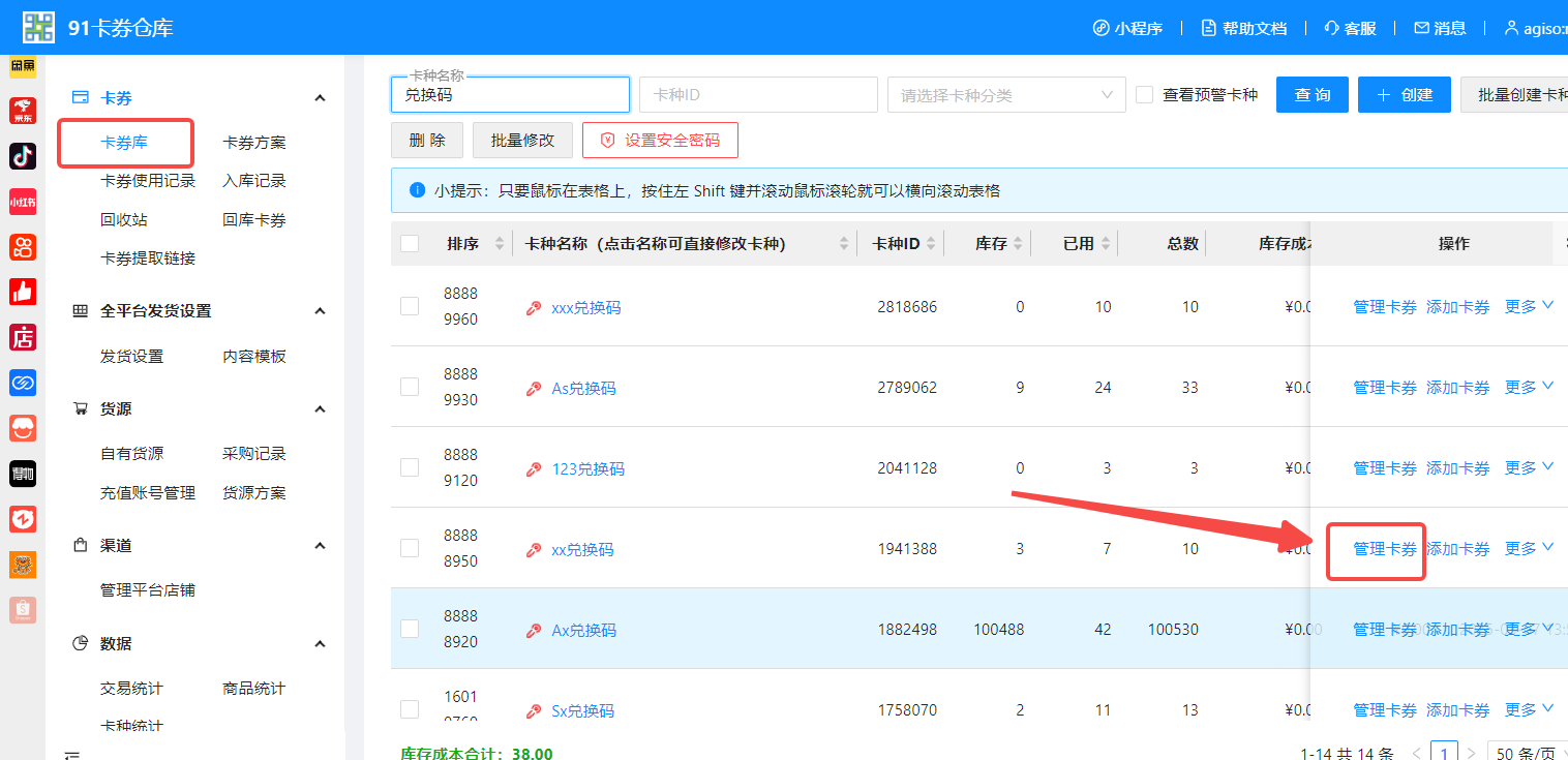 进入91卡券仓库---卡券库---找到对应卡种---管理卡券