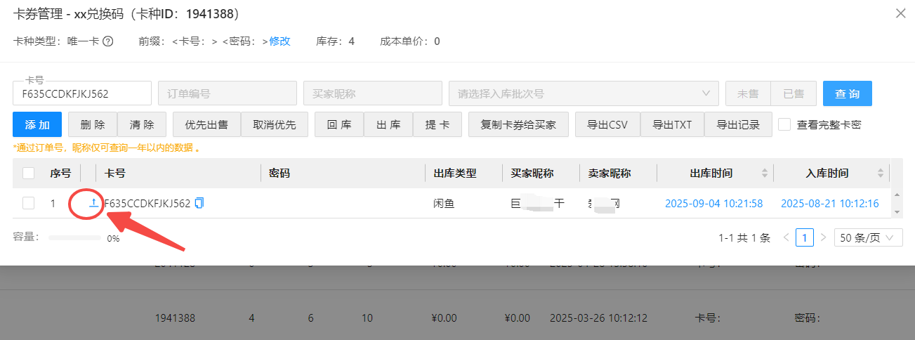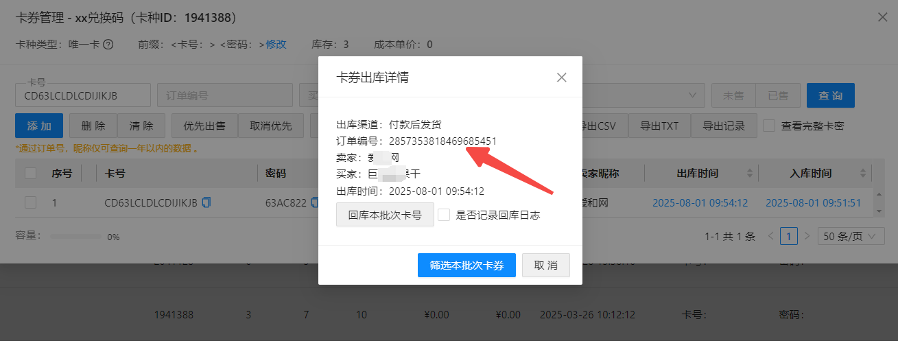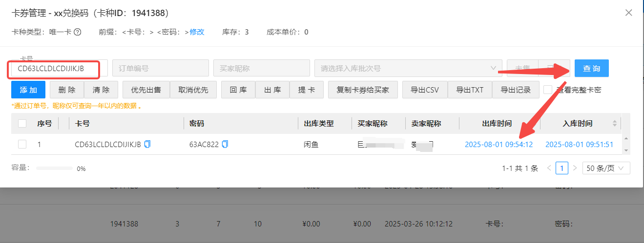 ---弹出窗口里输入卡券---查询---点击出库时间---即可查看订单编码,或其它卡券出库信息