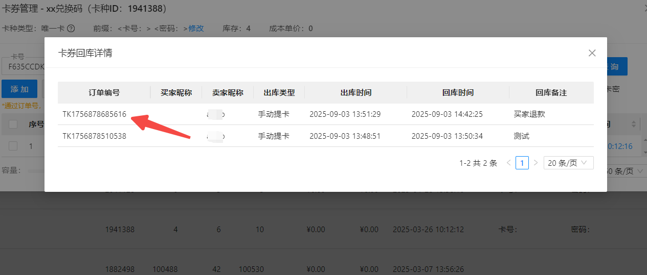 ---如果是回库卡密,则可点击卡号旁蓝色小图标---就可查看订单号。