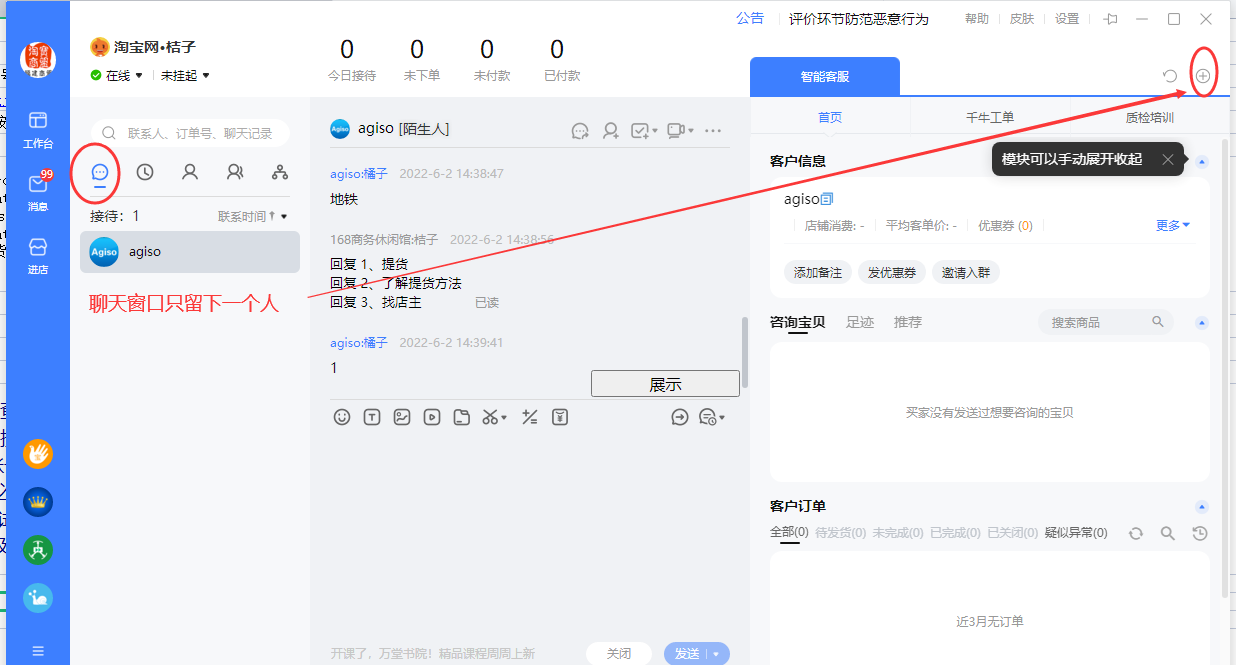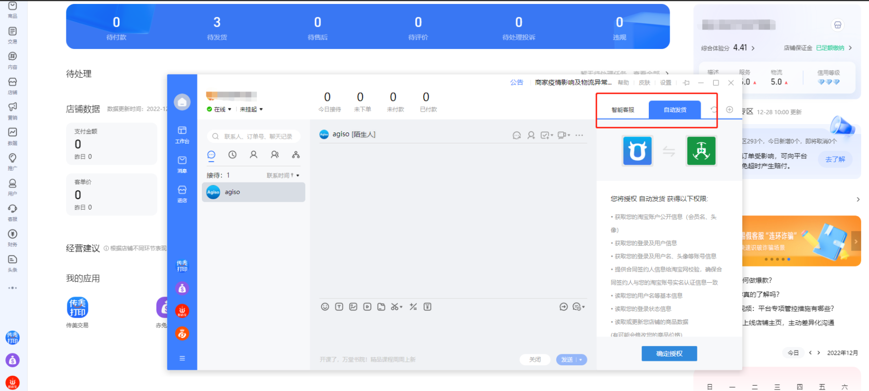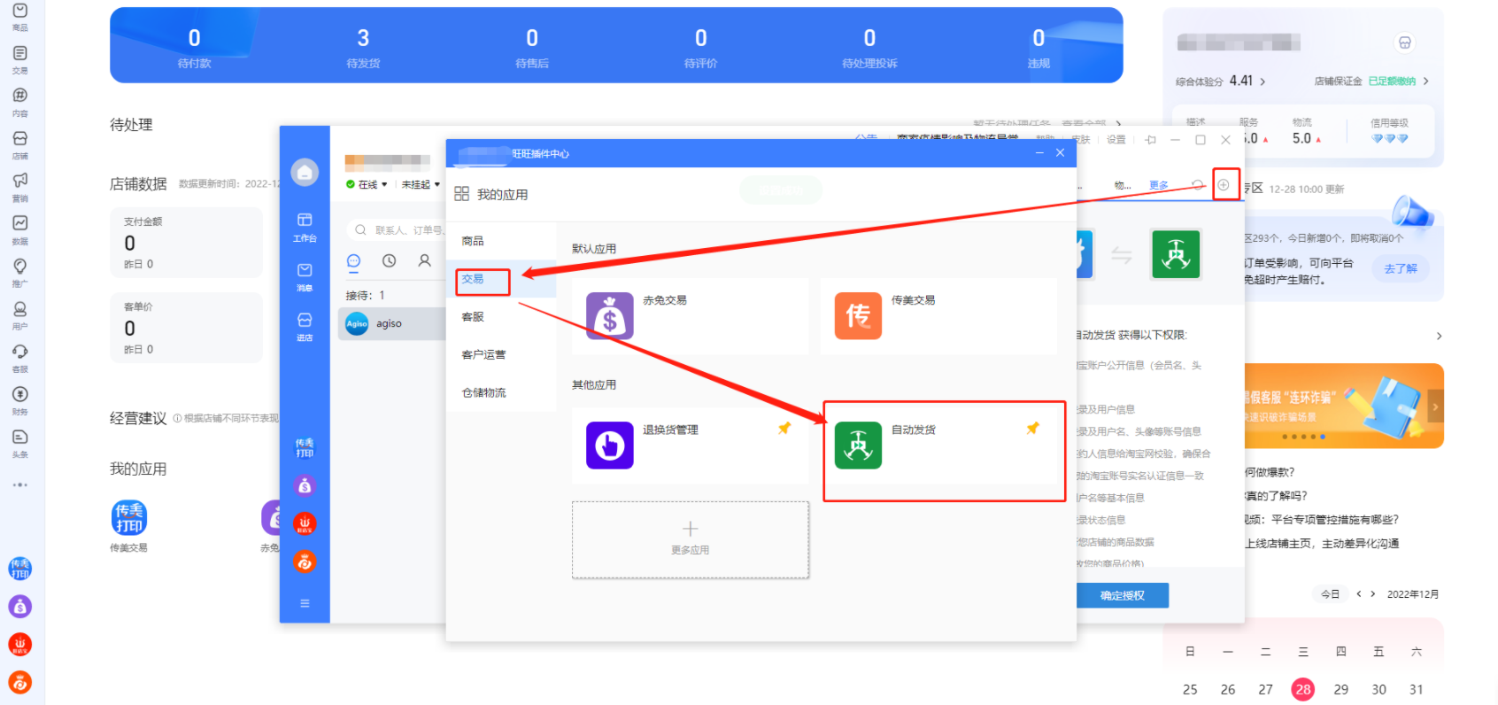 千牛登录子账号---找到接待中心---随便找一个联系人或者搜索agiso---点开聊天窗口---点击加号图标---交易---添加自动发货