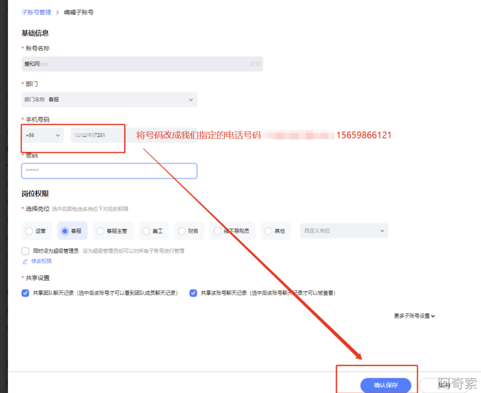 登录千牛主号---店铺---子账号管理---修改子账号信息---将电话号码改回指定电话