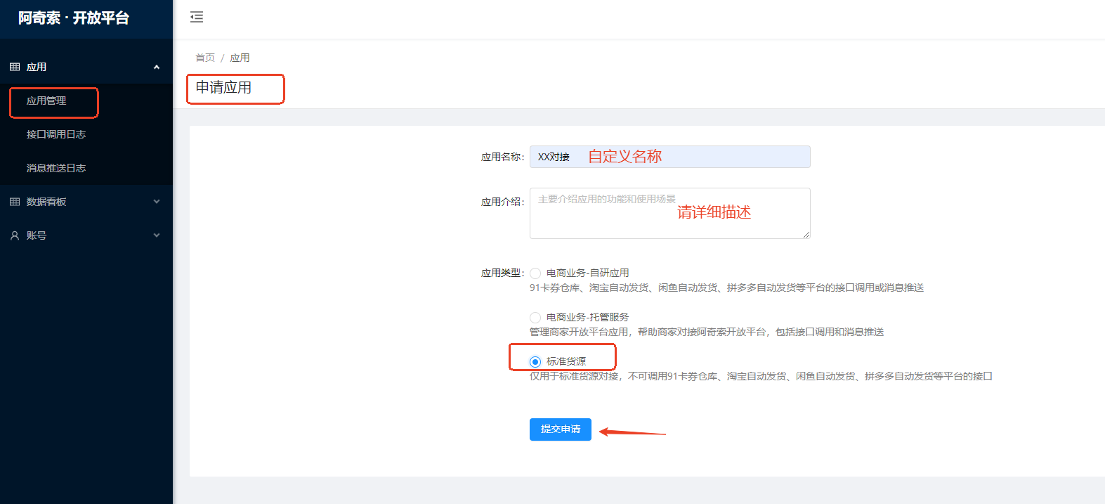 注册后需要提交资质审核,通过后即可进行应用创建,注意需选择“标准货源”