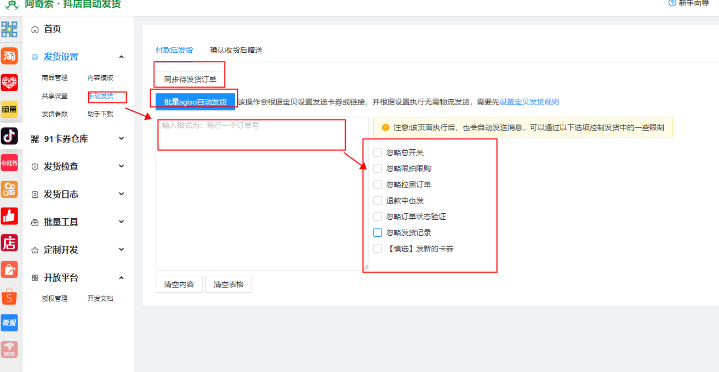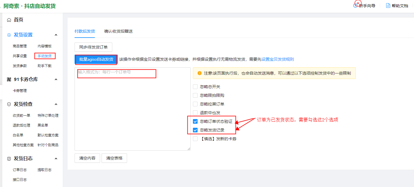 手动发货---手动输入订单号---发货选项按需求勾选---批量agiso自动发货