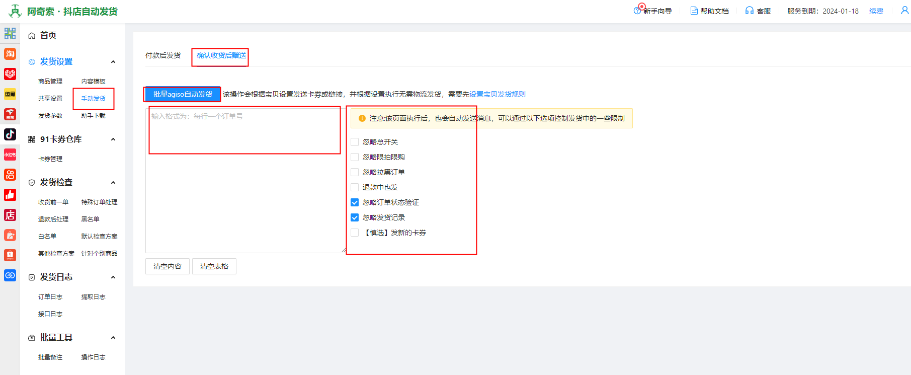 手动发货---确认收货后赠送---输入订单号---按需求选择发货条件---点击批量agiso自动发货