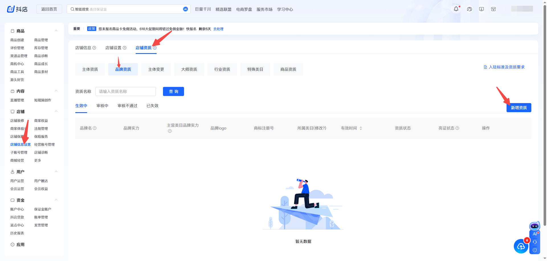 入口:店铺信息设置/店铺资质/品牌资质,通过【新增资质】完善你的资质