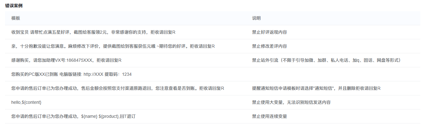 内容规范:模板内容需可以明确判断企业业务场景及发送目的,不支持发送以下类型内容: * 禁止发送涉及以下信息的短信:POS机、代开发票、金融、毒品、赌博、众筹、慈善募捐、股票、移民、面试招聘、彩票、返利、贷款、催款、投资理财、中奖、一元夺宝、一元秒杀、刷单、A货、医疗、整形、美容、会所、酒吧、足浴、暴力、恐吓、色情、内容不雅、皮草、助考、商标注册、加群、加QQ或者加微信、贩卖个人信息、APP下载链接、申请好评返现、宣传短信通道、用户拉新、用户召回、运营商相关(营业厅,移动,联通,电信等)、党政议论、上访维权、迷信、八卦风水、及其他违反法律法规的内容; * 不允许向非企业会员用户发送短信,例如针对邀请注册、邀请加入会员等短信内容。