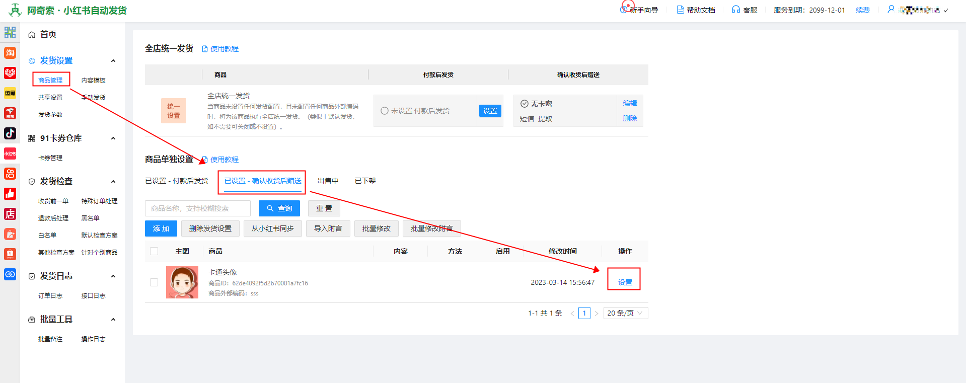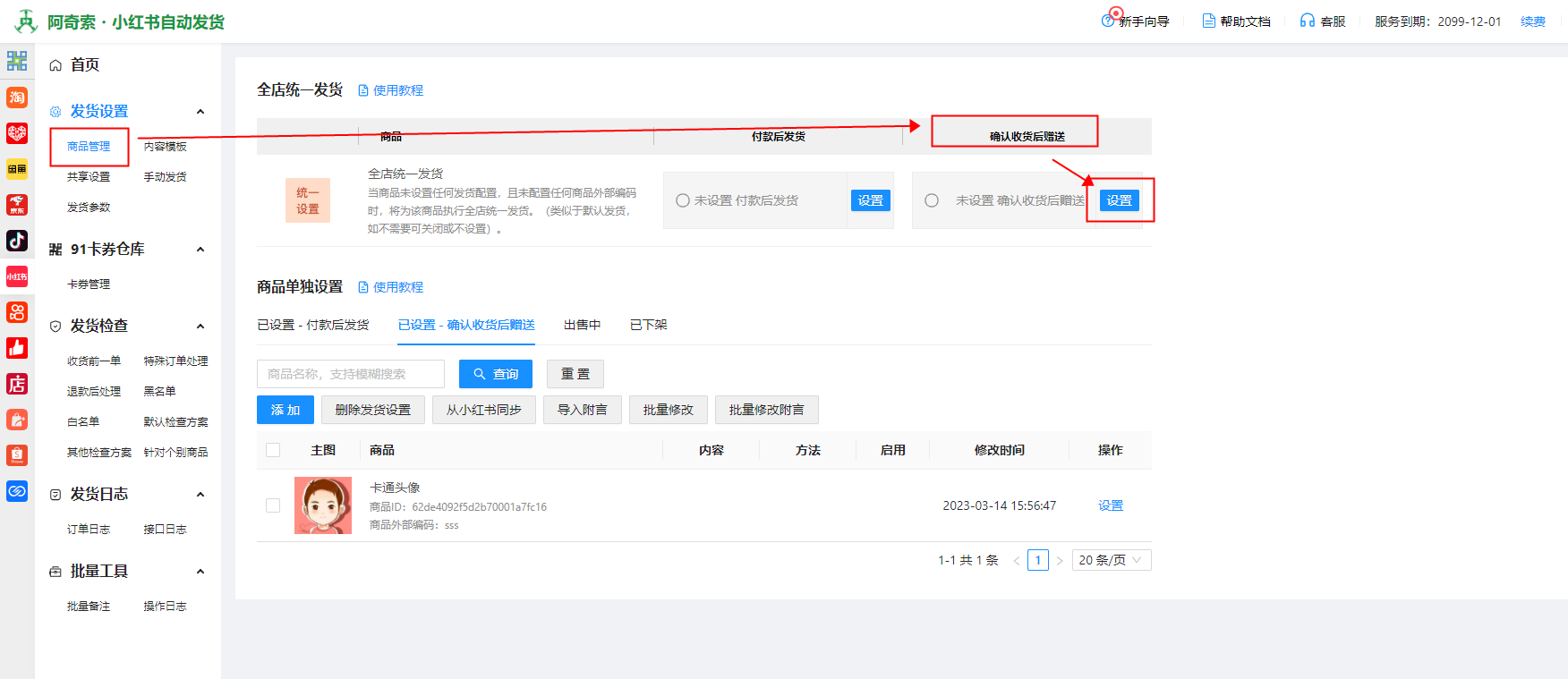 步骤一:单独商品设置确认收货后赠送