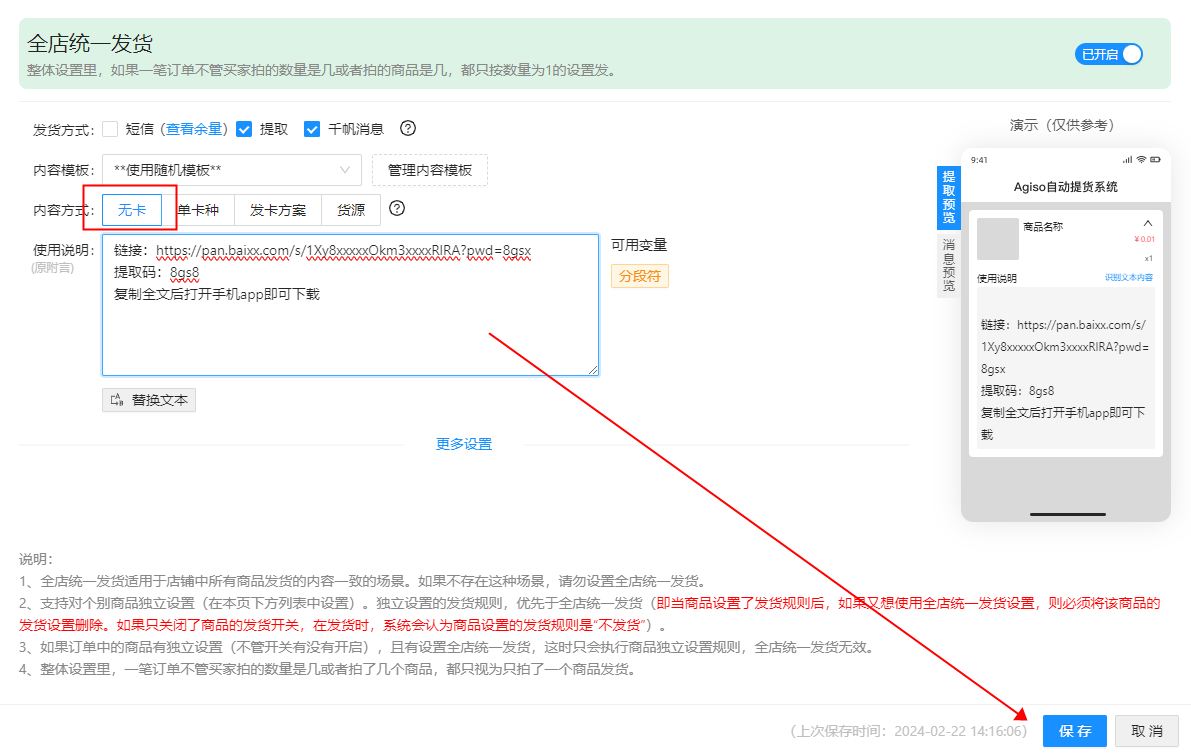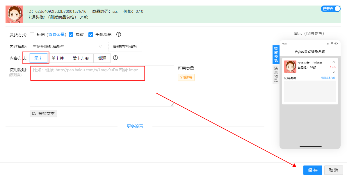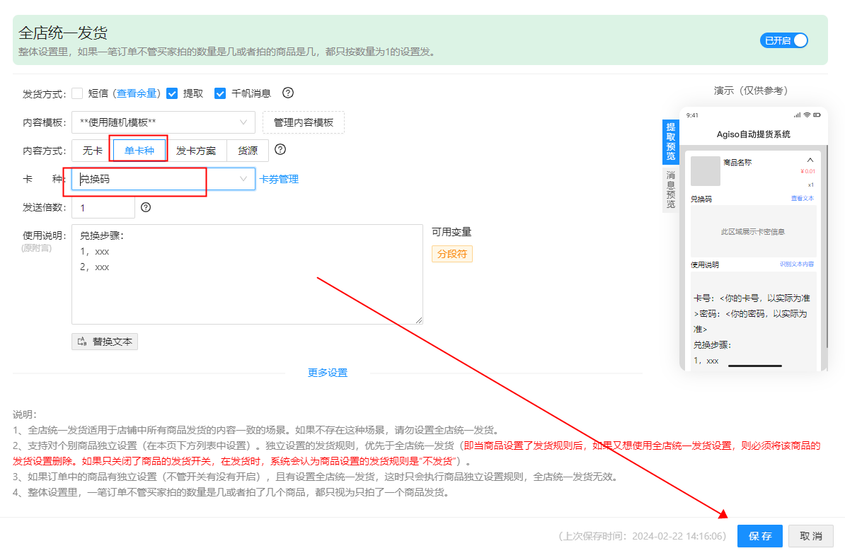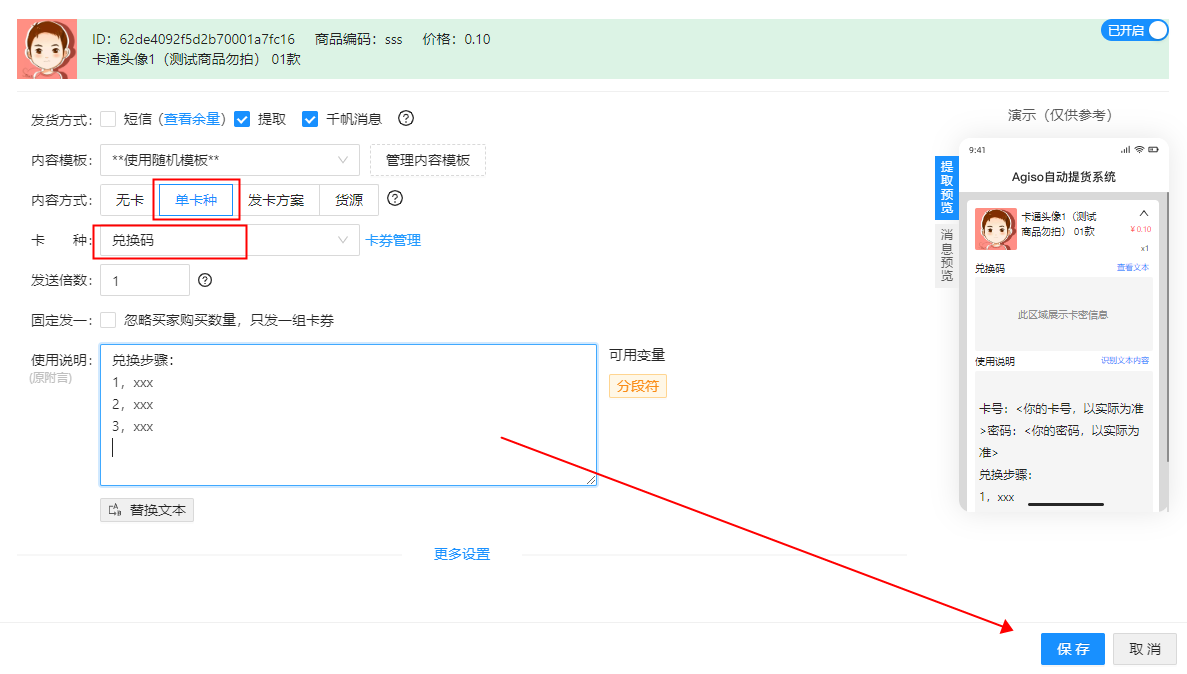 内容方式:选择单卡种---选择要发货的卡种---在使用说明里添加上除卡券信息外还需要发送给买家的消息内容---保存