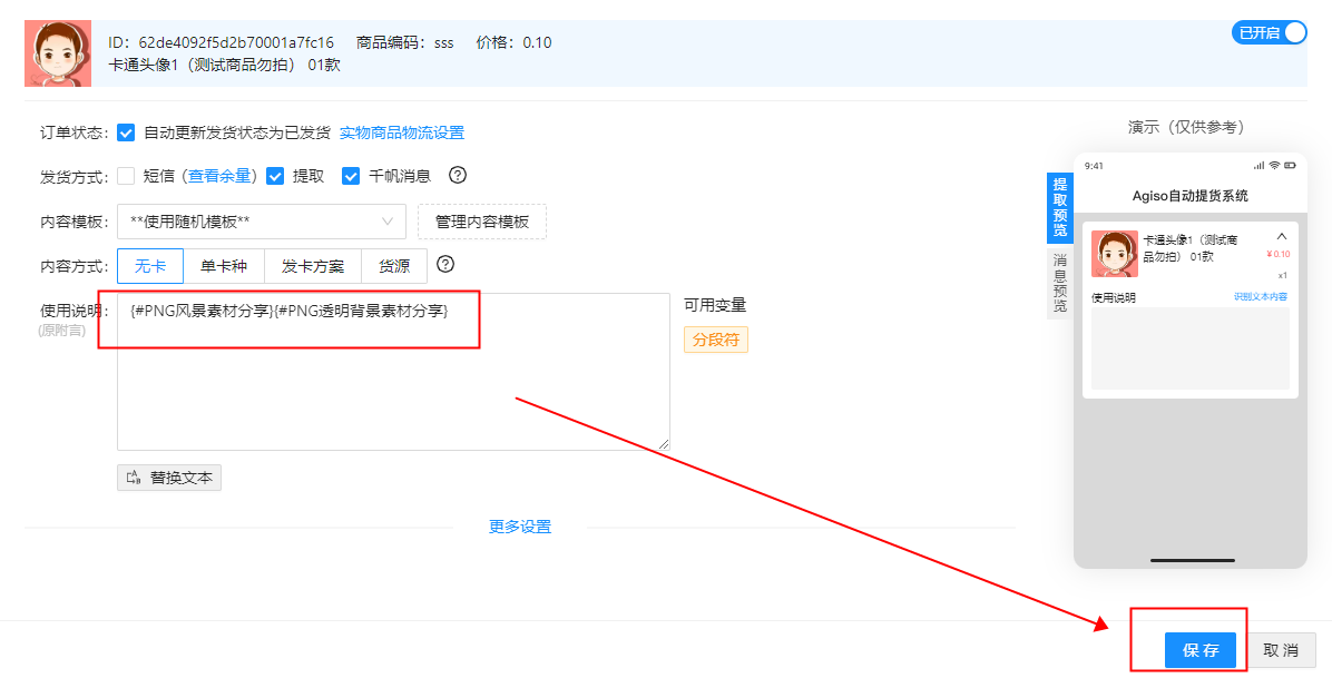 附言里的关键词为变量,买家收到的会是替换文本内容即 我当前设置的 “www.pngfengjing.sucsi/idsfhfenx”