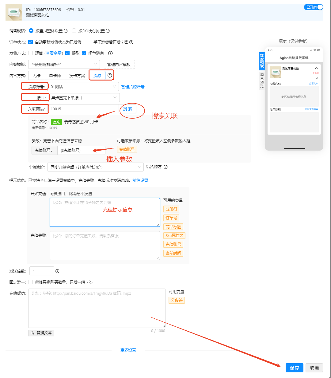 内容方式:货源--选择货源账号--选择接口类型--搜索关联商品(不同货源关联方式有差异)--插入参数--根据需要填写充值提示信息,记得保存。