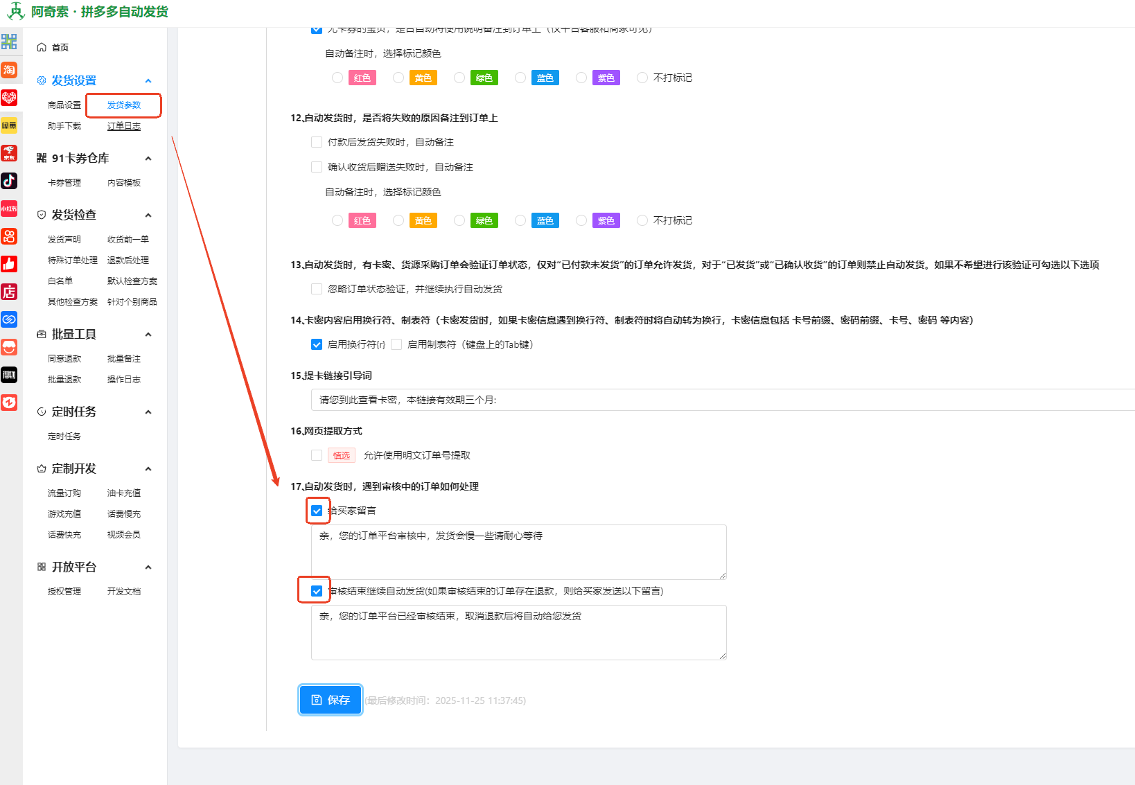 进入自动发货后台--发货参数--“自动发货时,遇到审核中的订单如何处理”