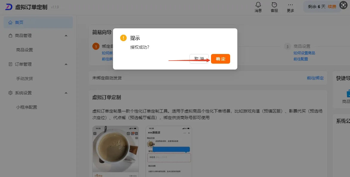 进入虚拟C2B软件--首页--简易向导--绑定自动发货--前往绑定--根据引导确认授权/确认绑定自动发货--确定