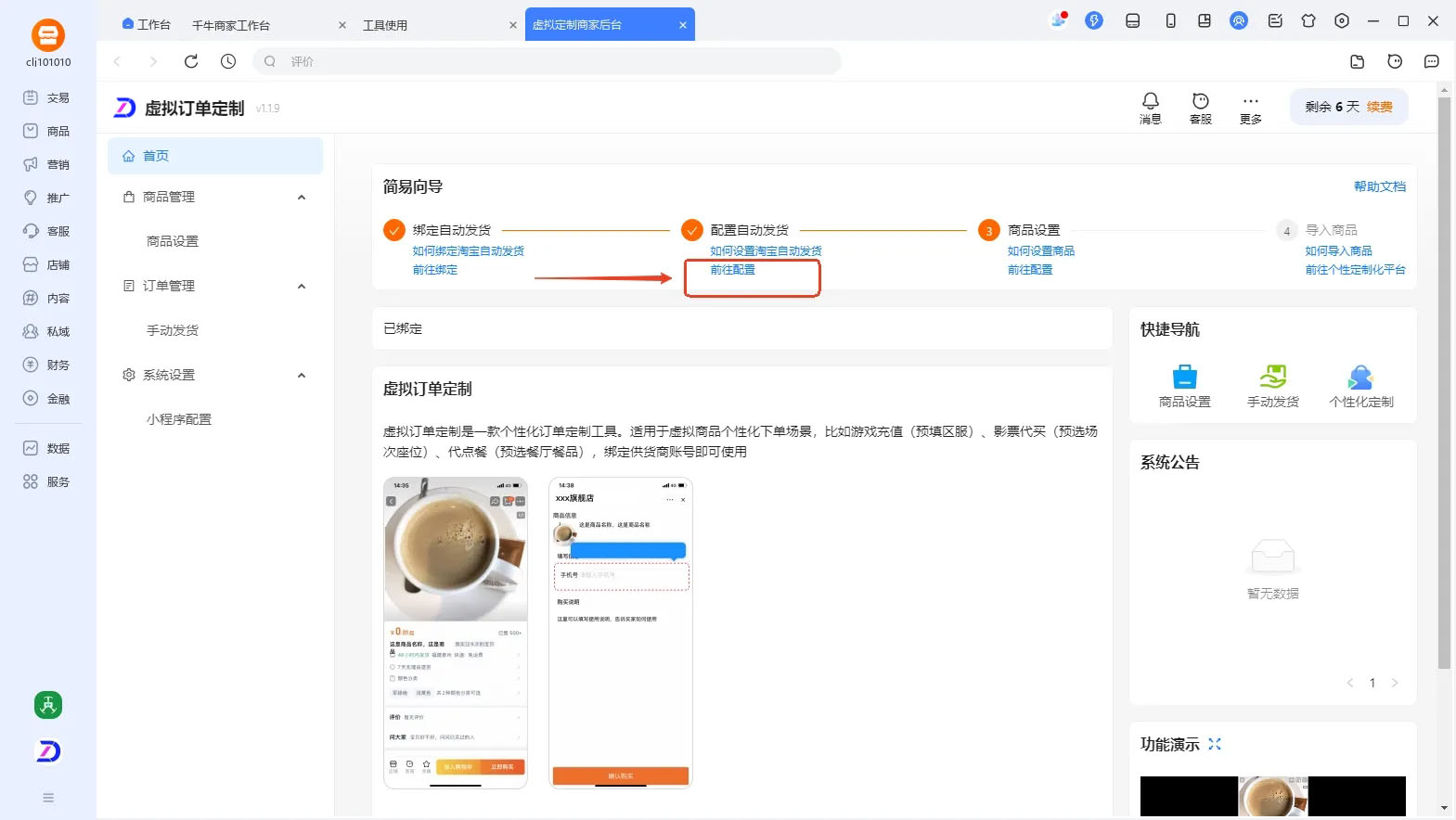 如下图【虚拟订单定制】首页--配置自动发货--前往配置(或者直接从自动发货后台进入)