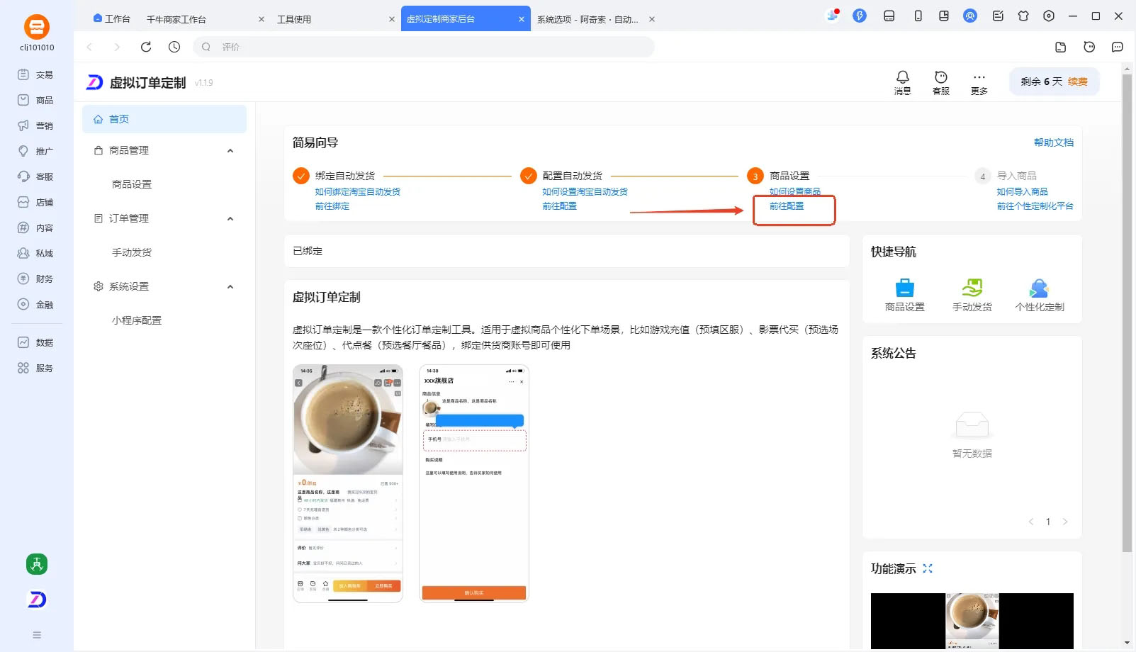 如下图【虚拟订单定制】首页--商品设置--前往配置,将跳转到商品设置。