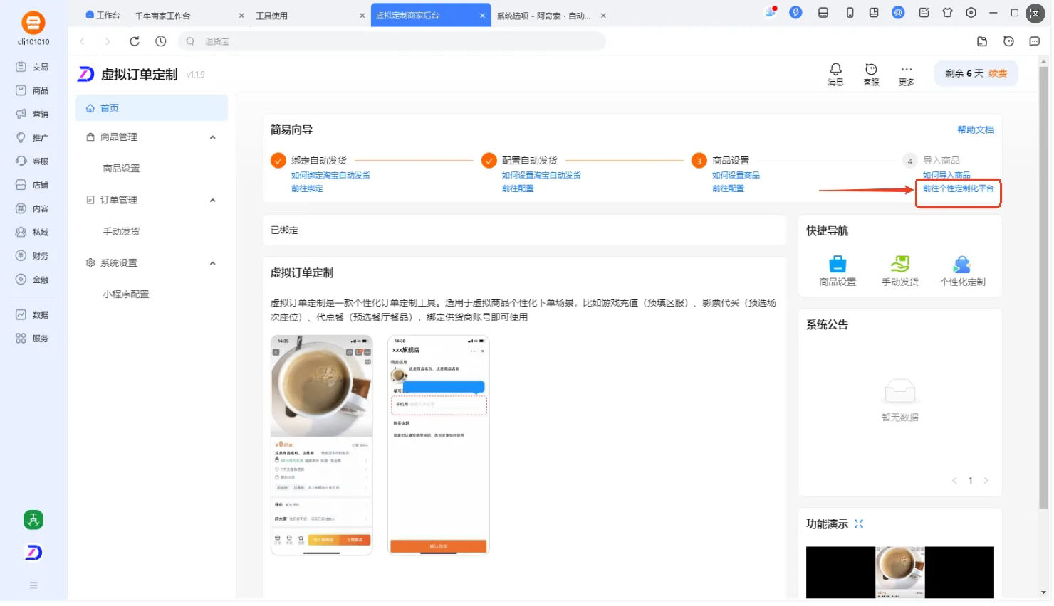 如下图【虚拟订单定制】首页--导入商品--前往个性化定制平台