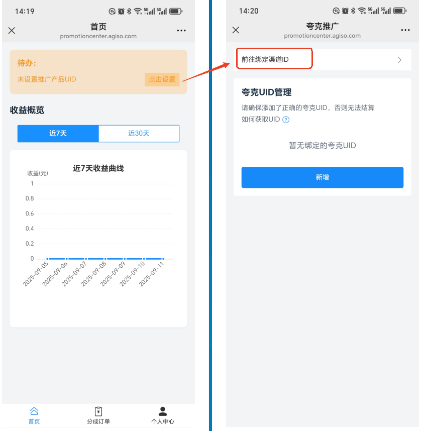 手机下载夸克并登录后,待办:为设置推广UID--点击设置--前往绑定渠道ID