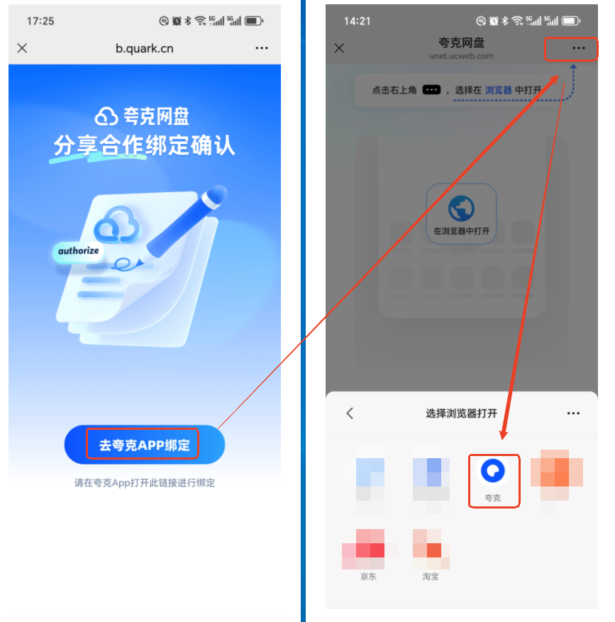 --去夸克APP绑定--右上角下拉选择在浏览器打开--选择夸克浏览器