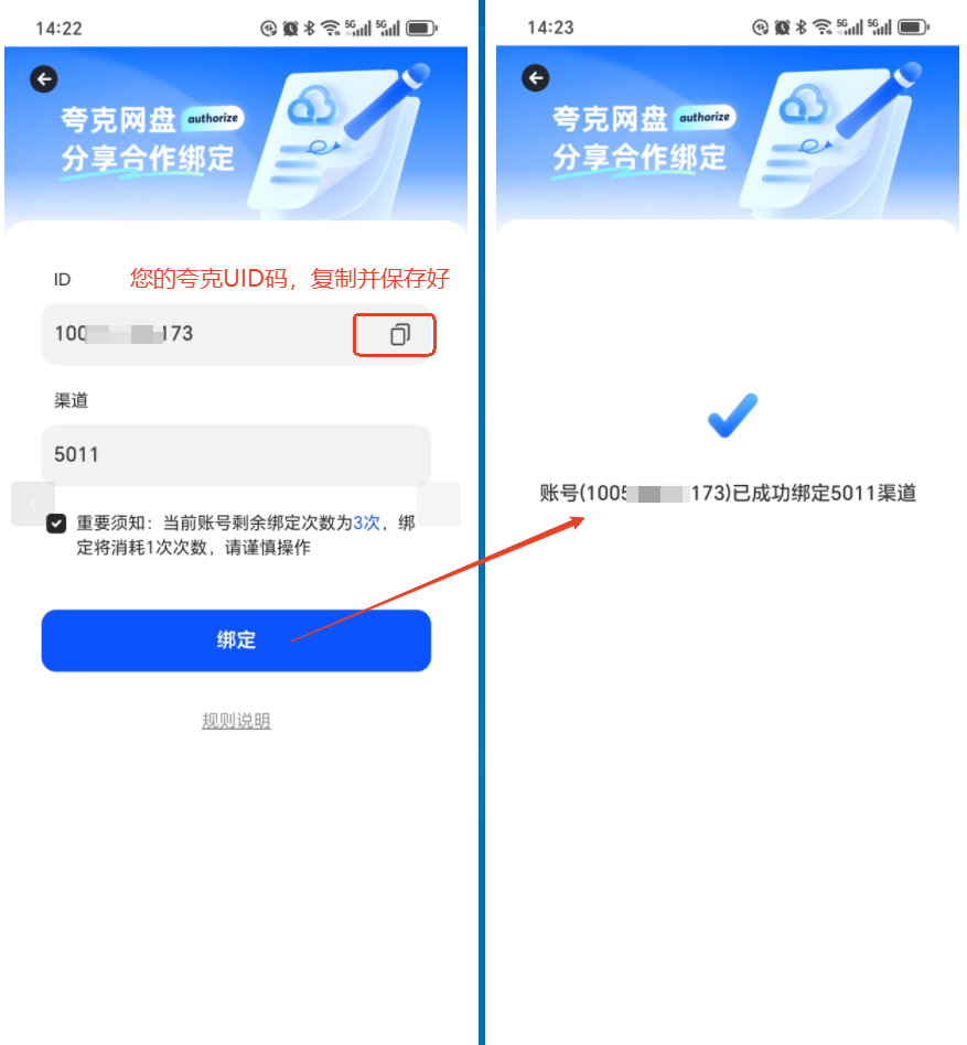 --复制并保存好您的UID,勾选重要须知后--绑定--成功绑定5011渠道