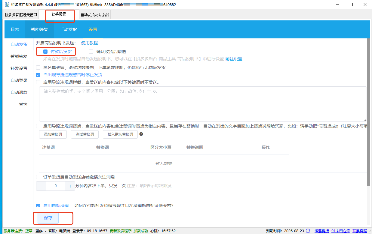登录发货助手--助手设置--自动发货--开启商品说明书发送--选择发送场景:"付款后发货"或"确认收货后赠送"--记得保存