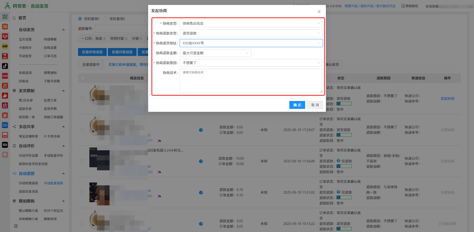 1、自动拒绝退款功能,遇到协商订单,将不处理。需前往手动批量退款功能操作
