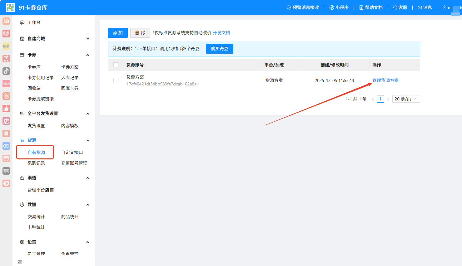 订购应用后,货源--自有货源将自动生成:货源方案--点击“管理货源方案”开始配置