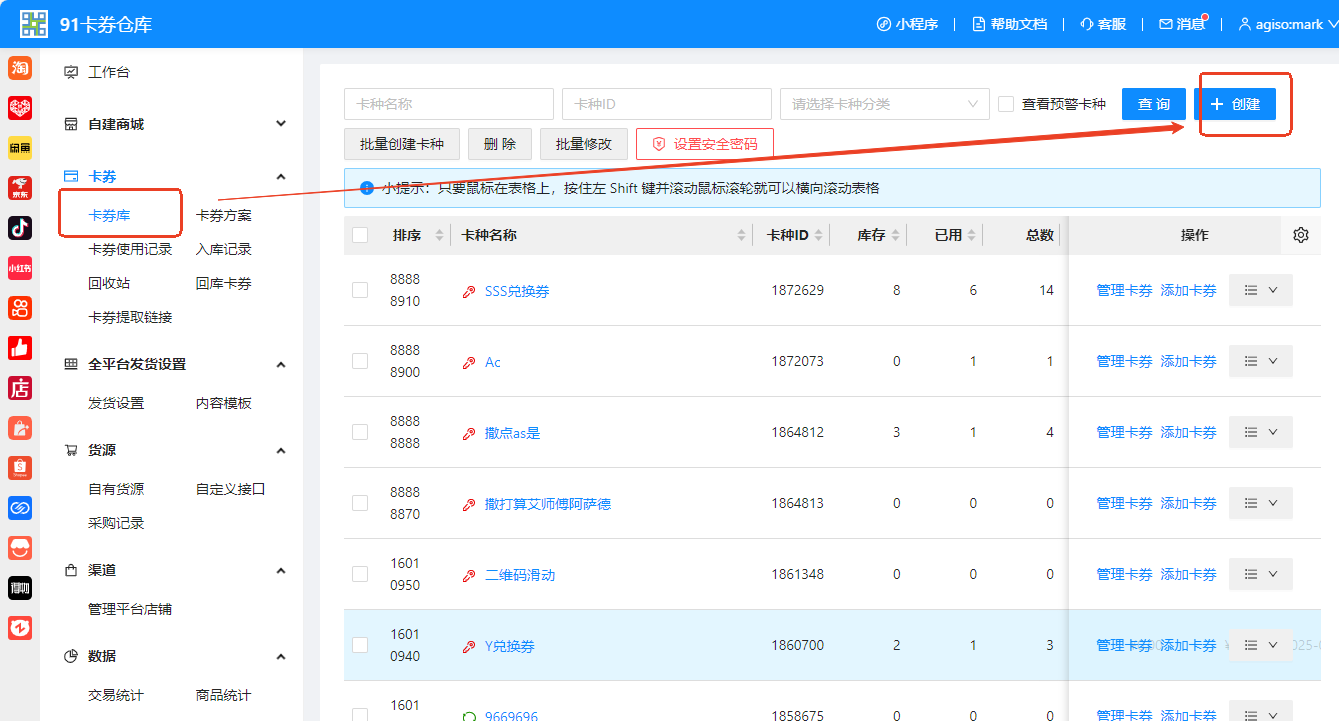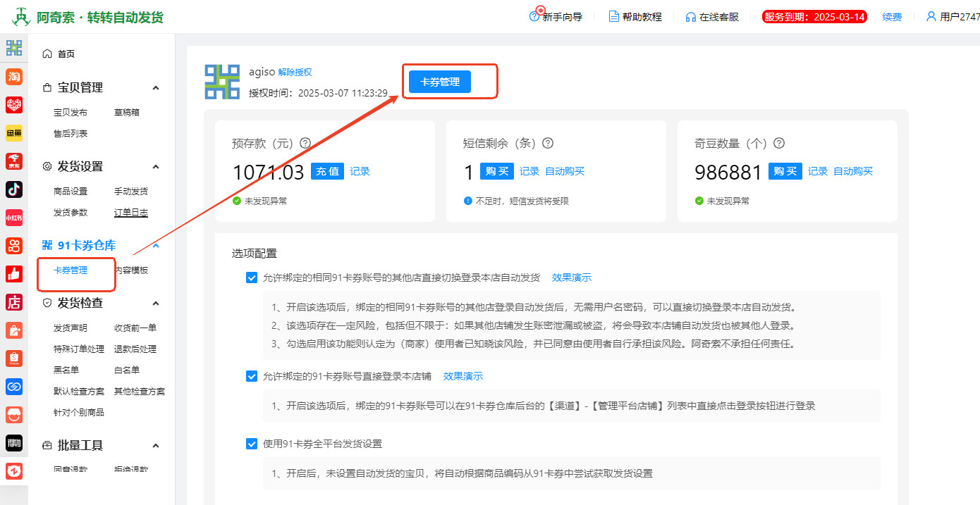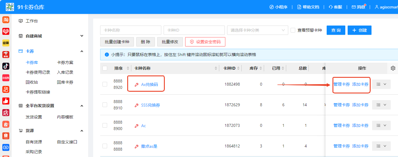 转转自动发货后台--卡券管理--点击卡券管理,进入已绑定的91卡券仓库