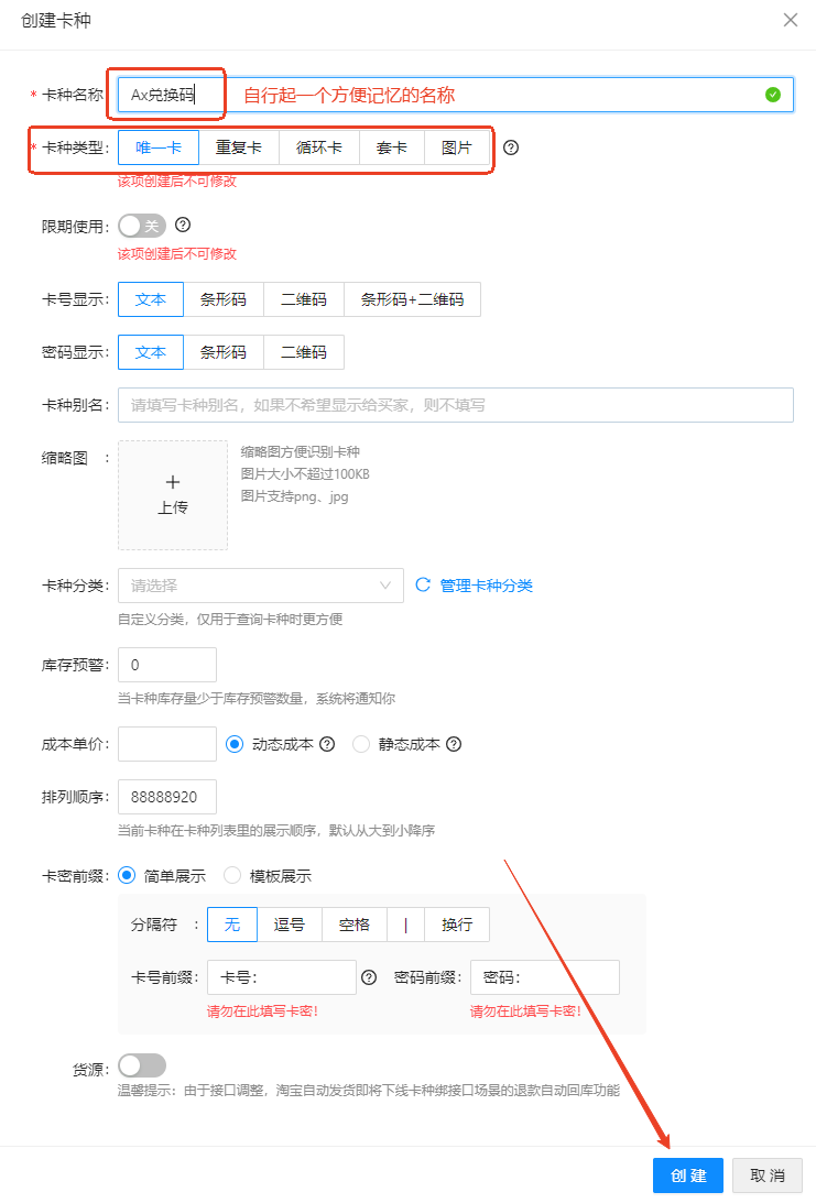 卡券库--创建--取个自己方便记忆的卡种名称--其余可按默认或根据需要填写--创建