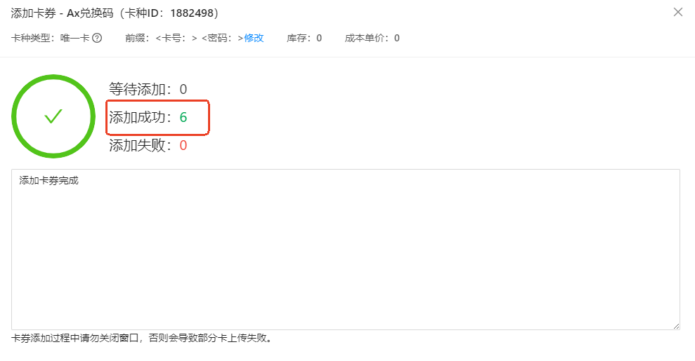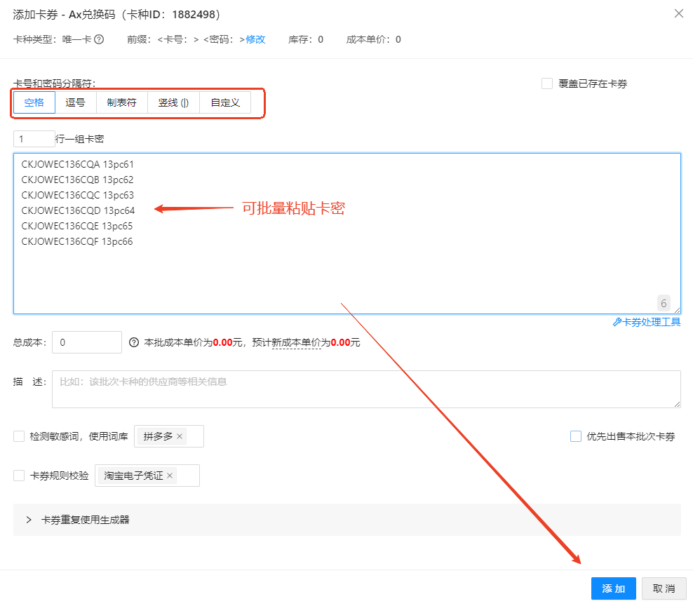 找到刚刚创建好的卡种--添加卡券--选择对应的分隔符--可批量粘贴卡密--添加--继续添加,