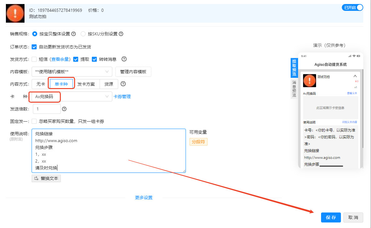 内容方式选单卡种--选择刚创建的卡种--将除卡密信息外需要发给买家的内容填入使用说明--记得保存。