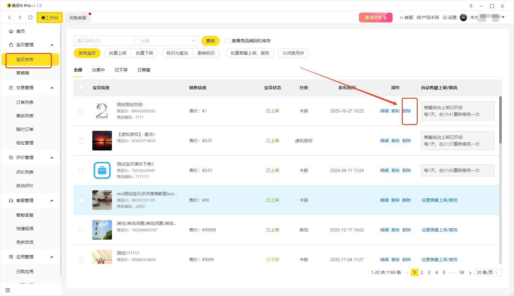 鱼店长--宝贝发布--找到对应记录--删除【删除后无法恢复,请谨慎操作】