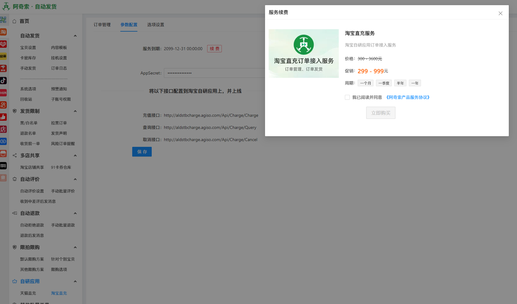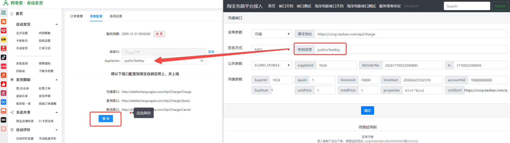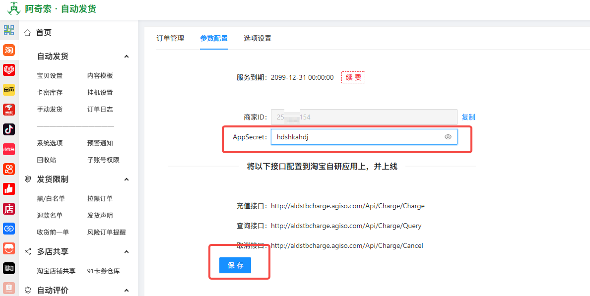 待小二下发生产密钥(AppSecret)后,将密钥配置至阿奇索自动发货系统(记得点保存),完成后即可进行下单测试。