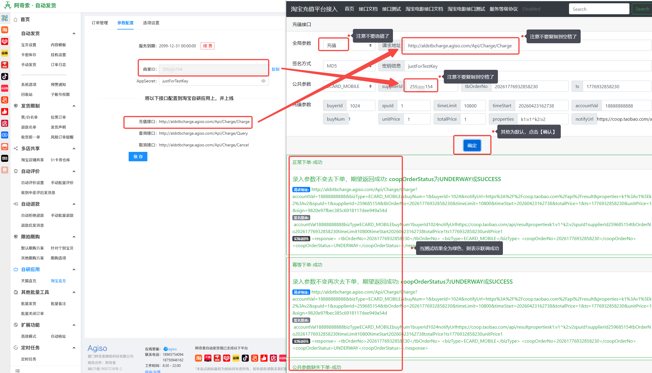 店铺【淘宝直充业务】首次对接到阿奇索自动发货软件,需要联调测试