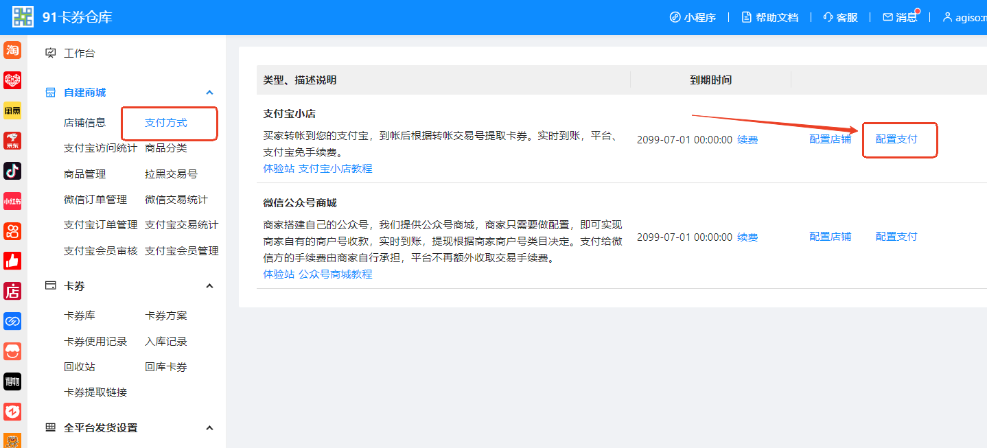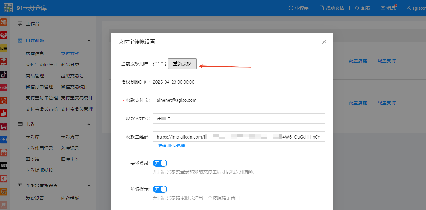 2、在无痕窗口登录91卡券--自建商城--支付方式--配置支付--重新授权--登录新的淘宝店铺--进行相应授权