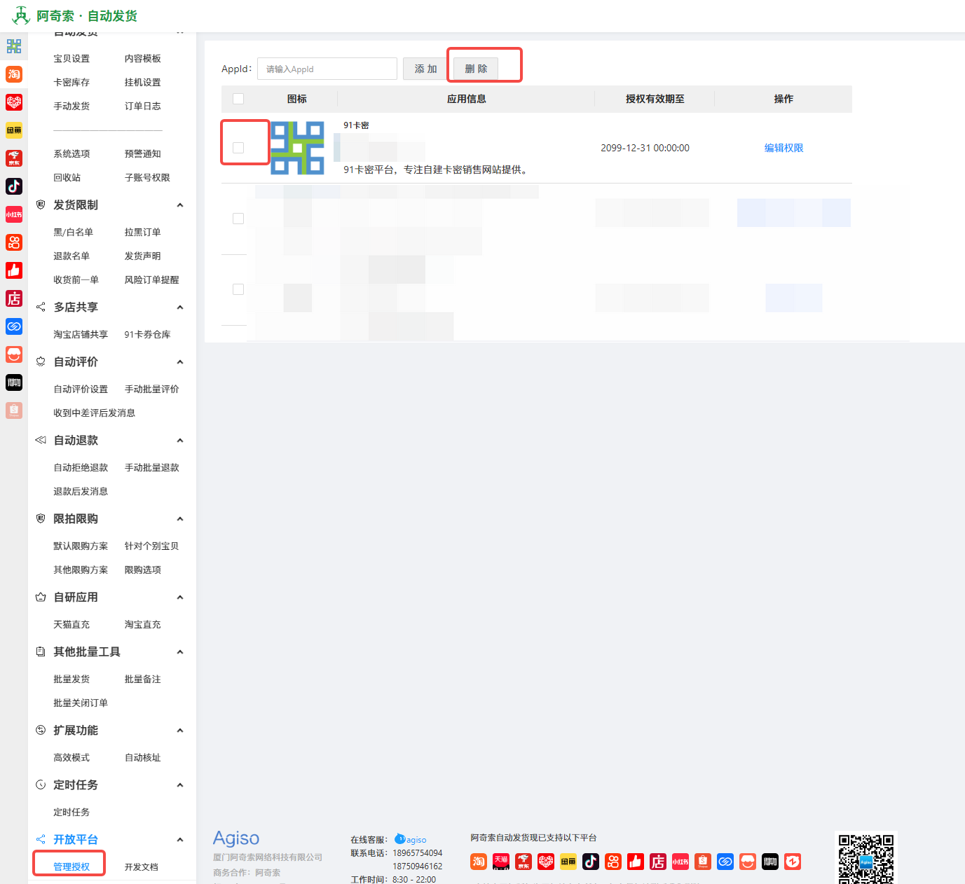 - 或者登录新店铺,还是提示授权已存在。此时登录新店铺的自动发货后台,开放平台-管理授权,查看是否已经有别的91的授权,如果有将其删除后,91重新点授权即可