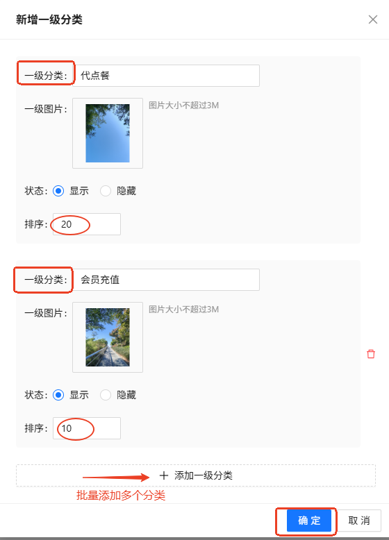 可批量添加多个一级分类,同时设置排序(数字大的排前面)