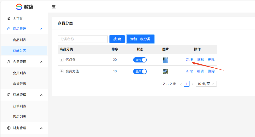 找到已创建的一级分类--新增