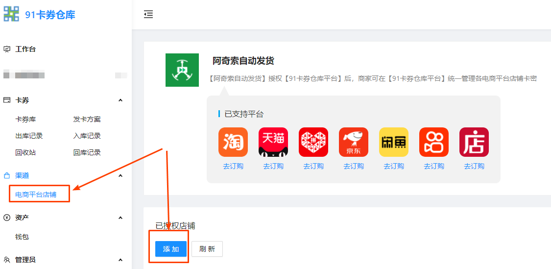 如要对授权店铺进行管理---店铺管理---进入91卡券仓库---授权店铺---可对店铺进行添加或删除