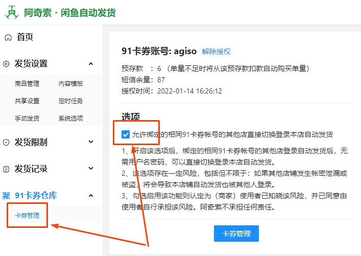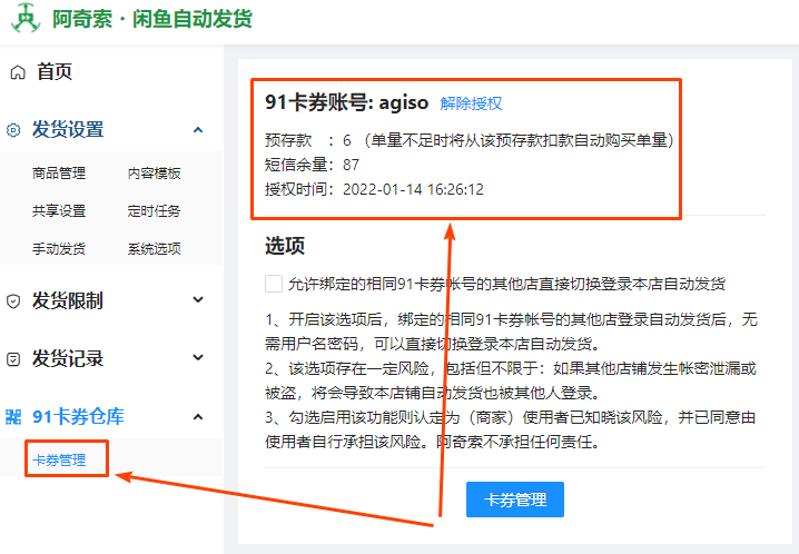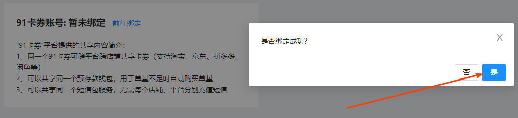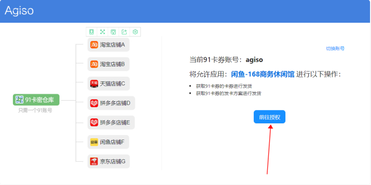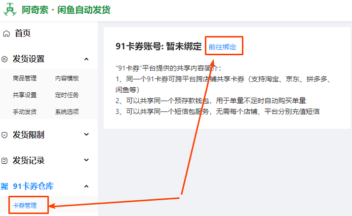 进入闲鱼自动发货页面---卡券管理---前往绑定---输入账号密码登录91卡券仓库---登录---前往授权---点击“是”